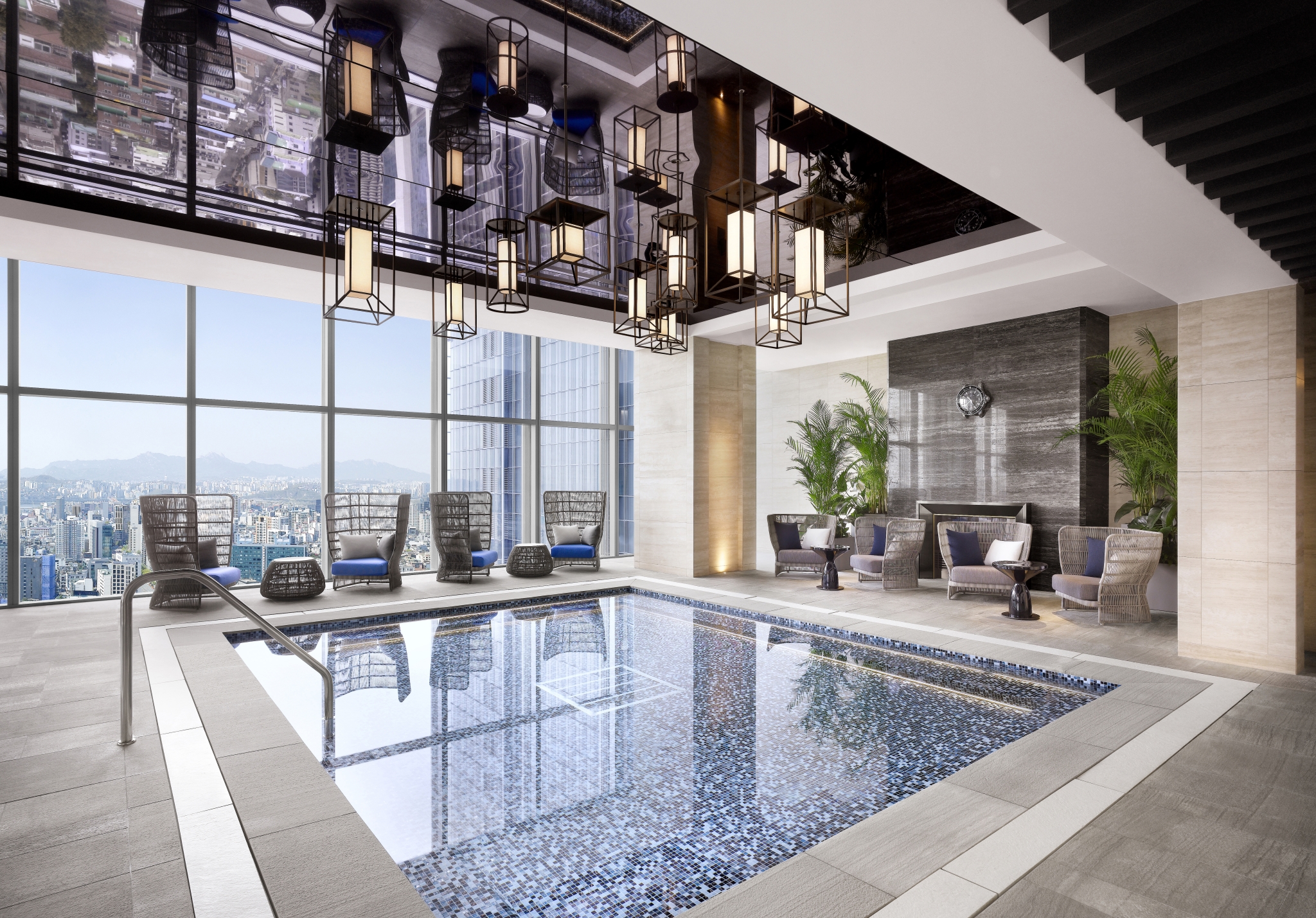 강남의 마천루를 한 눈에 간직한 조선 웰니스 클럽 실내 수영장에서 여유로운