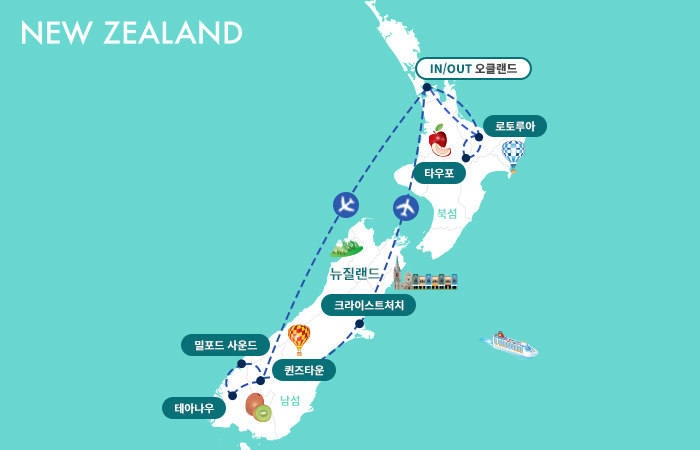 =호텔조식 =가이드 미팅 후 밀포드사운드로 이동 호머터널을 경유하여 이동 아름다운 풍경이 거울처럼 수면에 비치는 거울호수 =밀포드 사운드 피요르드 해안 관광 밀포드 유람선 탑승 https://www.kaltour.com/photogal/Large/ZQN202.jpg 약 1만2천년전 빙하에 의해 형성된 피요르드 해안의 절경 감상 https://livehtsweb.kaltour.com/fileupload/photogal/Large/ZQN391.jpg 만년설이 녹아 만들어진 폭포수를 직접 맞을 수 있는 스털링 폭포, 마이터피크, 라이언마운틴 등 https://livehtsweb.kaltour.com/fileupload/photogal/Large/ZQN524.jpg (현지 기상 악화 시 언슬로 증기선 일정으로 대체될 수 있습니다.) =퀸즈타운으로 귀환 =석식 =호텔 투숙 및 휴식 호텔 상황에 따라 숙박지역이 변경될 수 있습니다. (크롬웰, 와나카, 인버카길 등) | ||