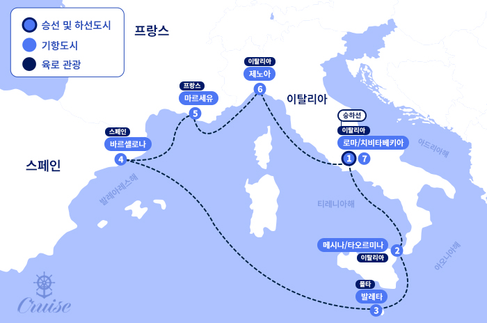 [도시 안내] ▶ 스페인 최대의 산업과 문회의 도시로 가우디의 예술혼이 살아 있는 바르셀로나 ▶ 아기자기하고 아름다운 남프랑스의 마르세이유 ▶ 이탈리아 북부의 최대 항구도시 제노아▶ 역사와 문화가 살아 숨쉬는 도시 로마▶ 지중해에서 가장 큰섬인 시칠리아의 메시나/타오르니마 ▶ 지중해의 영국으로 불리오는 유럽의 대표 휴양지 몰타